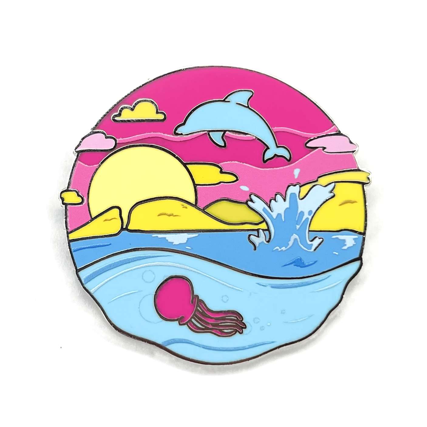 A snapshot of a pan flag colored beach, full of LGBTQ+ pride! Pin measures 1.5 inches and includes backing card in each package.